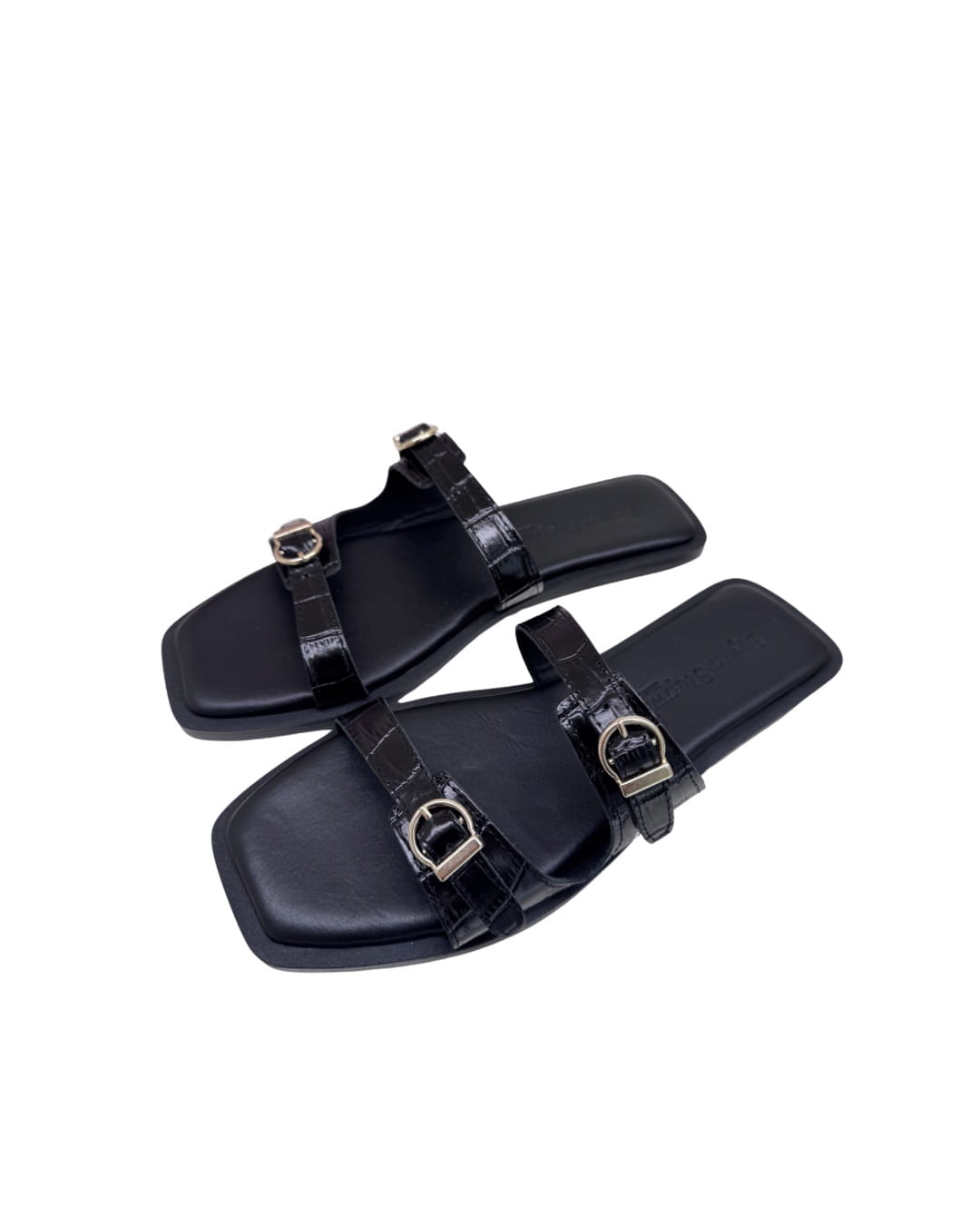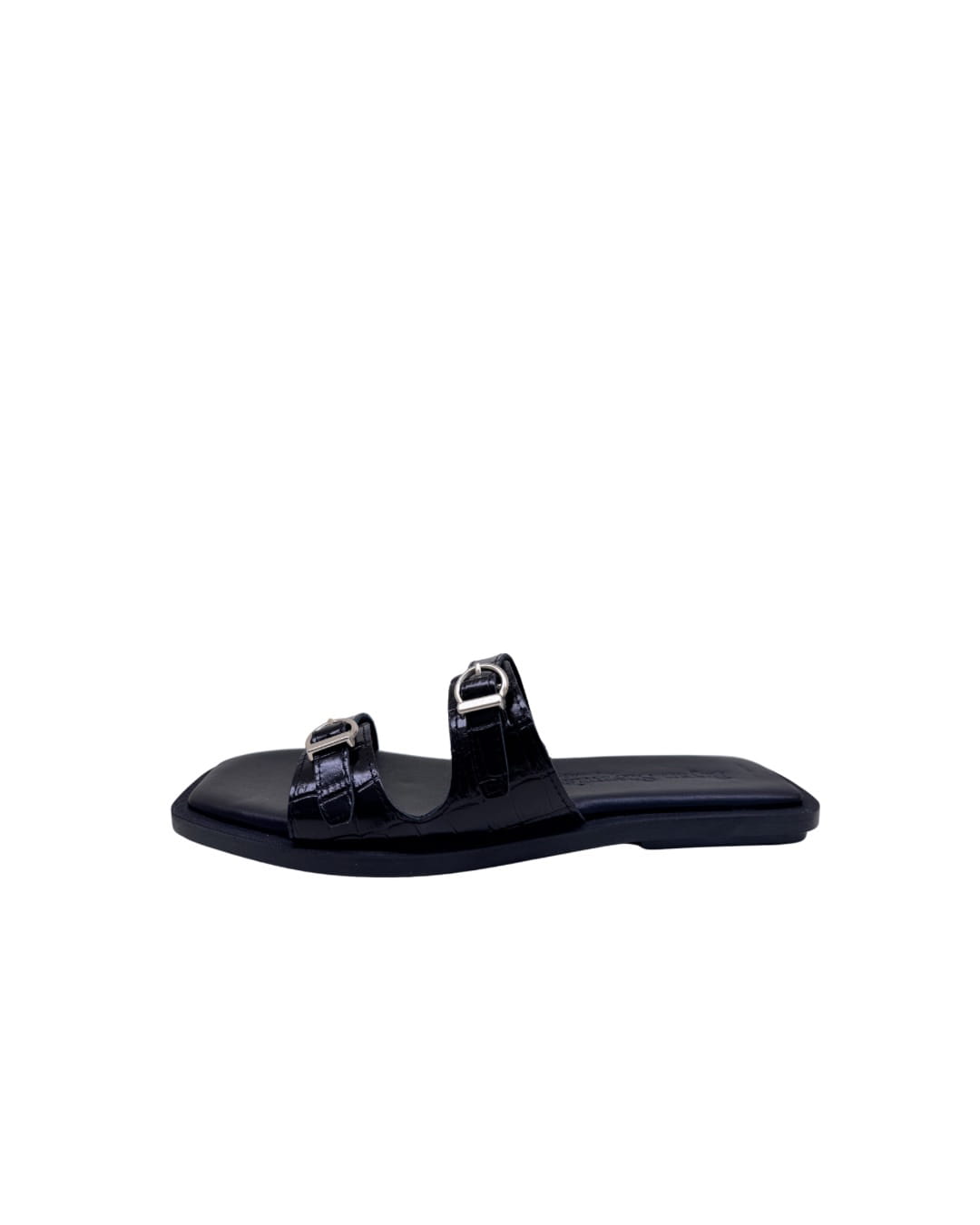 Esta sandalia plana destaca por su diseño de doble tira con acabado en efecto cocodrilo, aportando una textura diferente y atemporal a tus looks de verano.