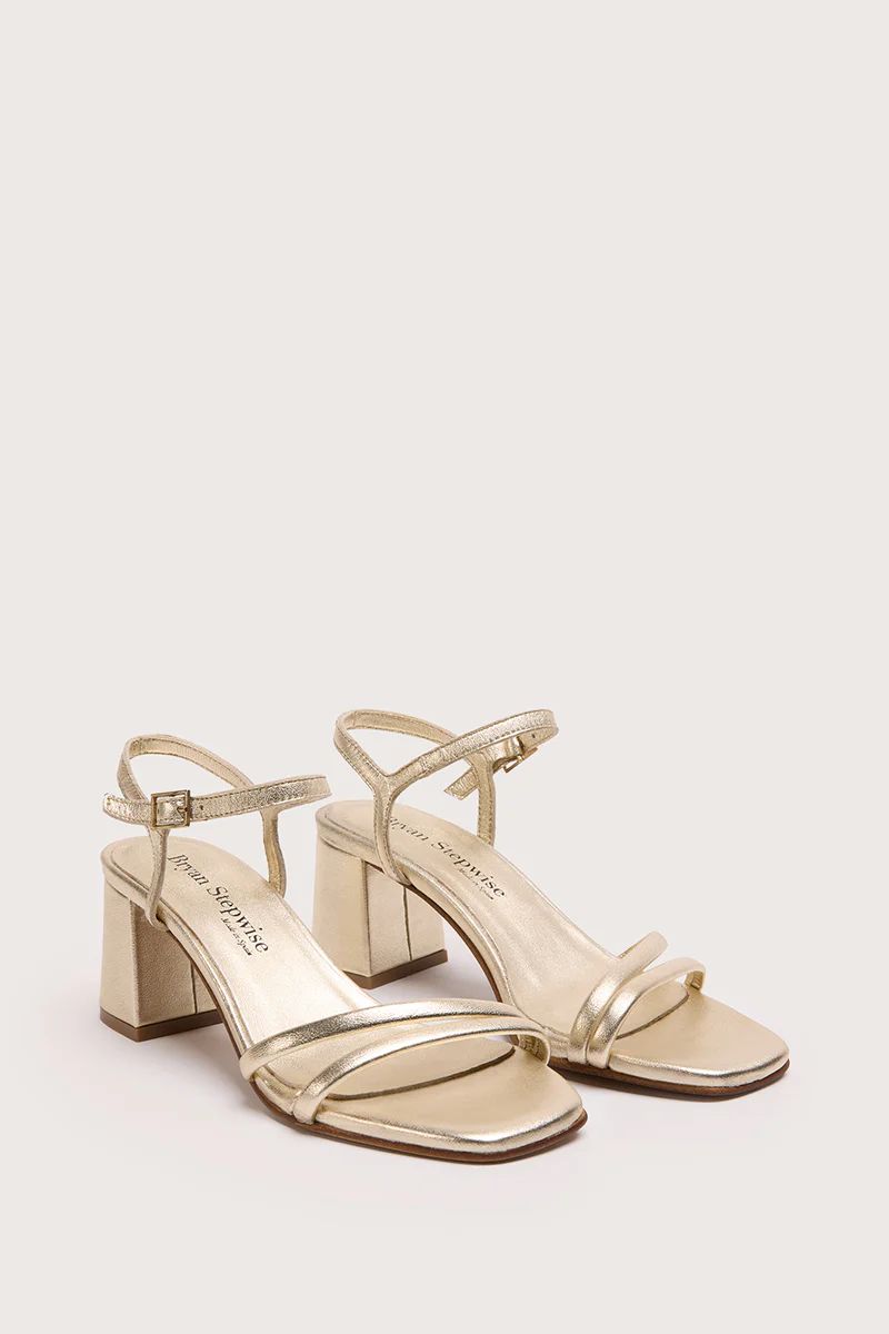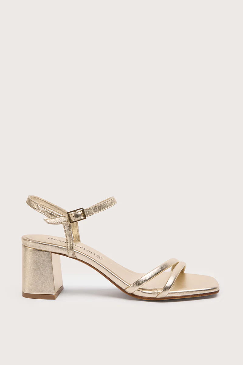 El aliado perfecto para tus eventos y noches especiales. Esta sandalia de tacón combina un diseño de tiras finas con un acabado dorado radiante, aportando luz y sofisticación a cualquier look de invitada o de noche.